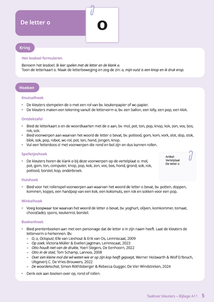 Elke activiteitenfiche begint met een inleidend gedeelte voor de leerkracht. Daarin staan de leerlijn, de lesdoelen, het benodigde materiaal, de voorkennis en de relevante woordenschat. Die voorbereiding zorgt ervoor dat het kringmoment doelgericht kan worden opgebouwd. In de kring wordt de voorkennis geactiveerd, het lesdoel in kleutertaal benoemd en nieuwe taal gemodelleerd.